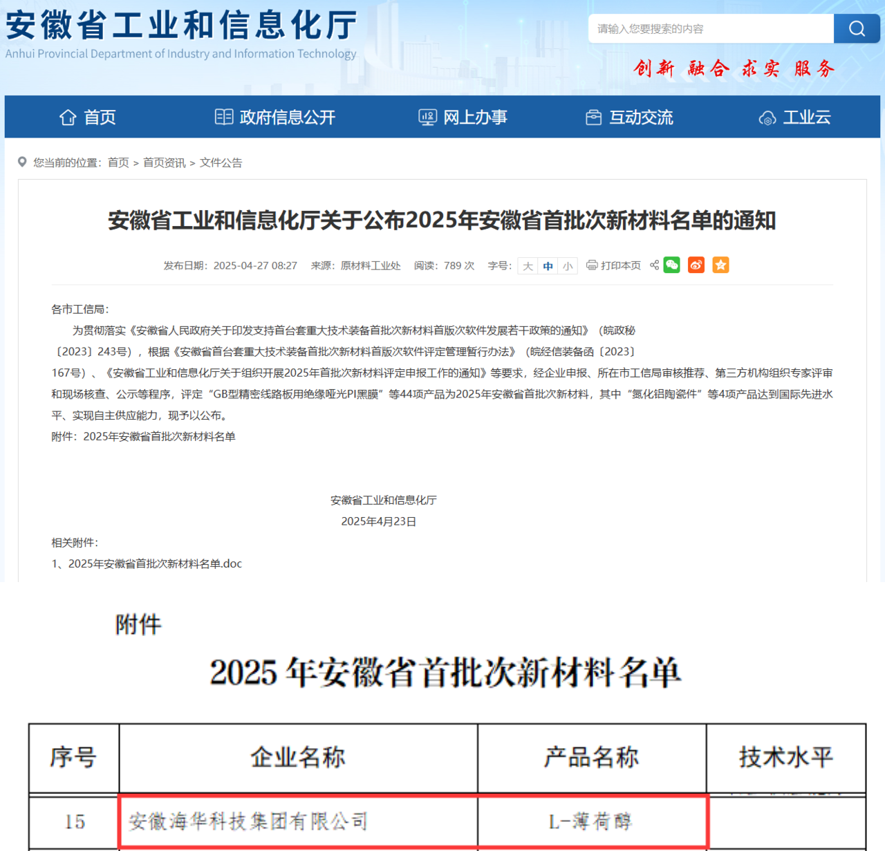 近期,安徽省工業(yè)和信息化廳正式公布了2025年度安徽省首批次新材料的認(rèn)定結(jié)果。安徽海華科技集團(tuán)有限公司研發(fā)的“L-薄荷醇”產(chǎn)品,經(jīng)評(píng)審被認(rèn)定為2025年度安徽省首批次新材料,并榮獲“國(guó)內(nèi)領(lǐng)先”級(jí)別。